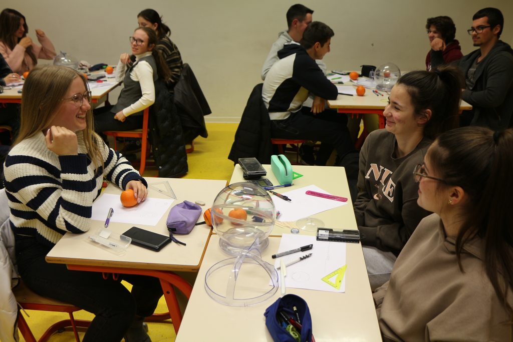 Imali su i svoj klasični školski pribor za geometriju pomoću kojeg su crtali/konstruirali na papiru/ravnini objekte koje su onda komparirali s nacrtanim/konstruiranim objektima na naranči i Lenartovoj sferi.