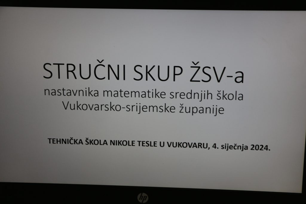 Radionica za nastavnike sudionike projekta „Matematički edukator za osnovne i srednje škole“ pod nazivom “Komparativna geometrija – poučavanje s uporabom pribora” održana je 4. siječnja 2024. godine u vremenu od 11 do 13 sati na stručnom skupu ŽSV-a Vukovarsko-srijemskoj županiji u Vukovaru u Tehničkoj školi Nikole Tesle..